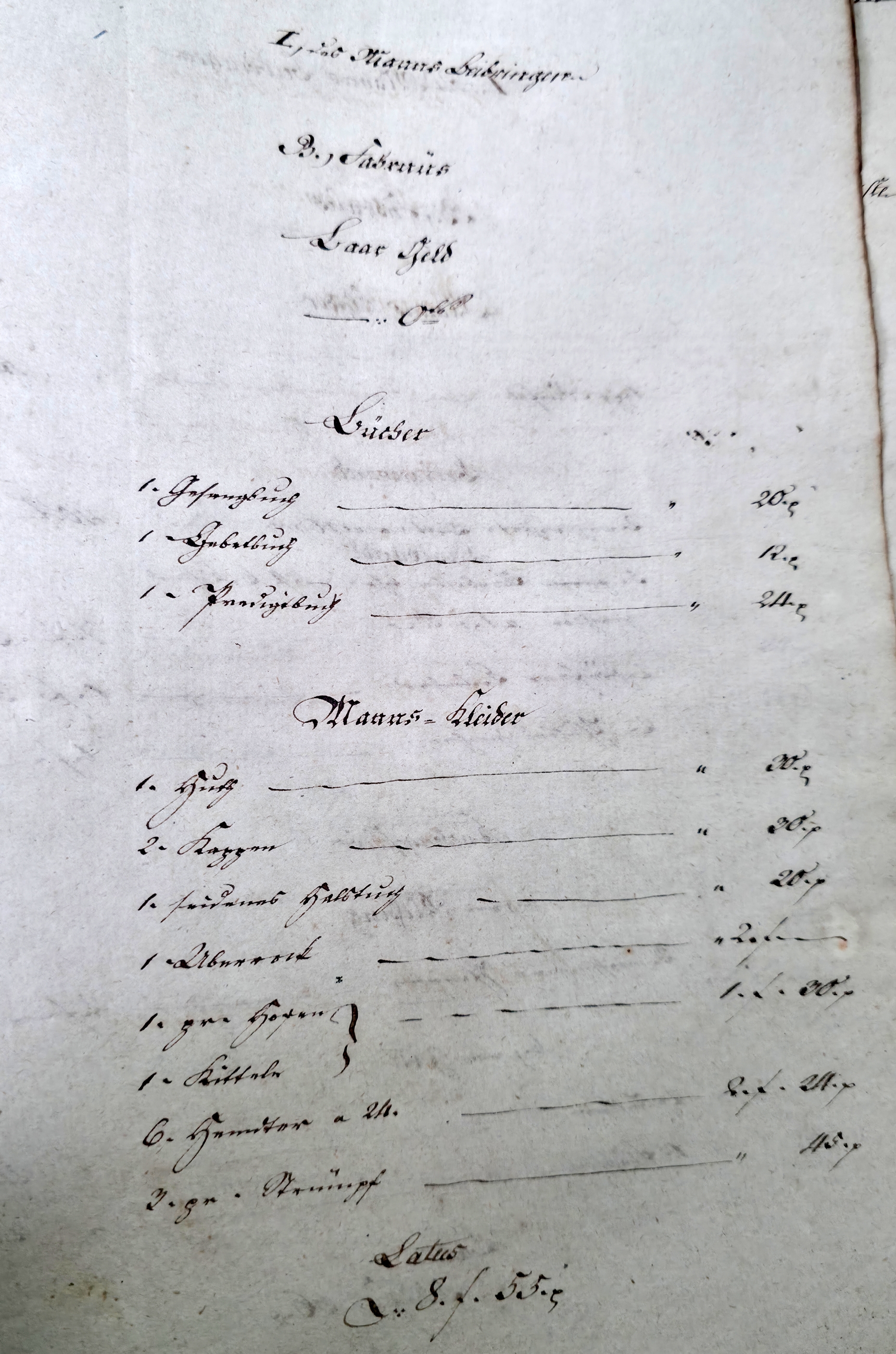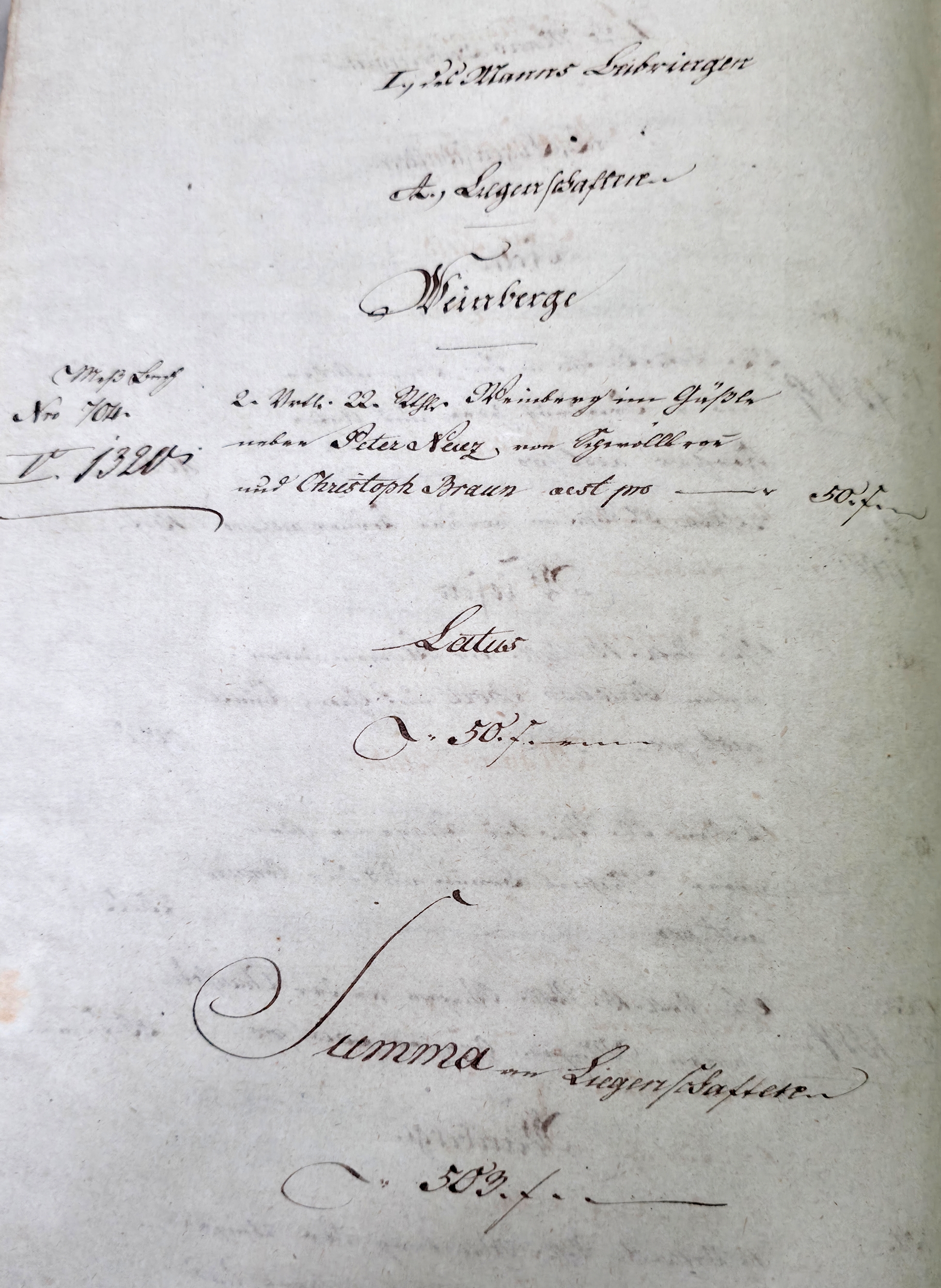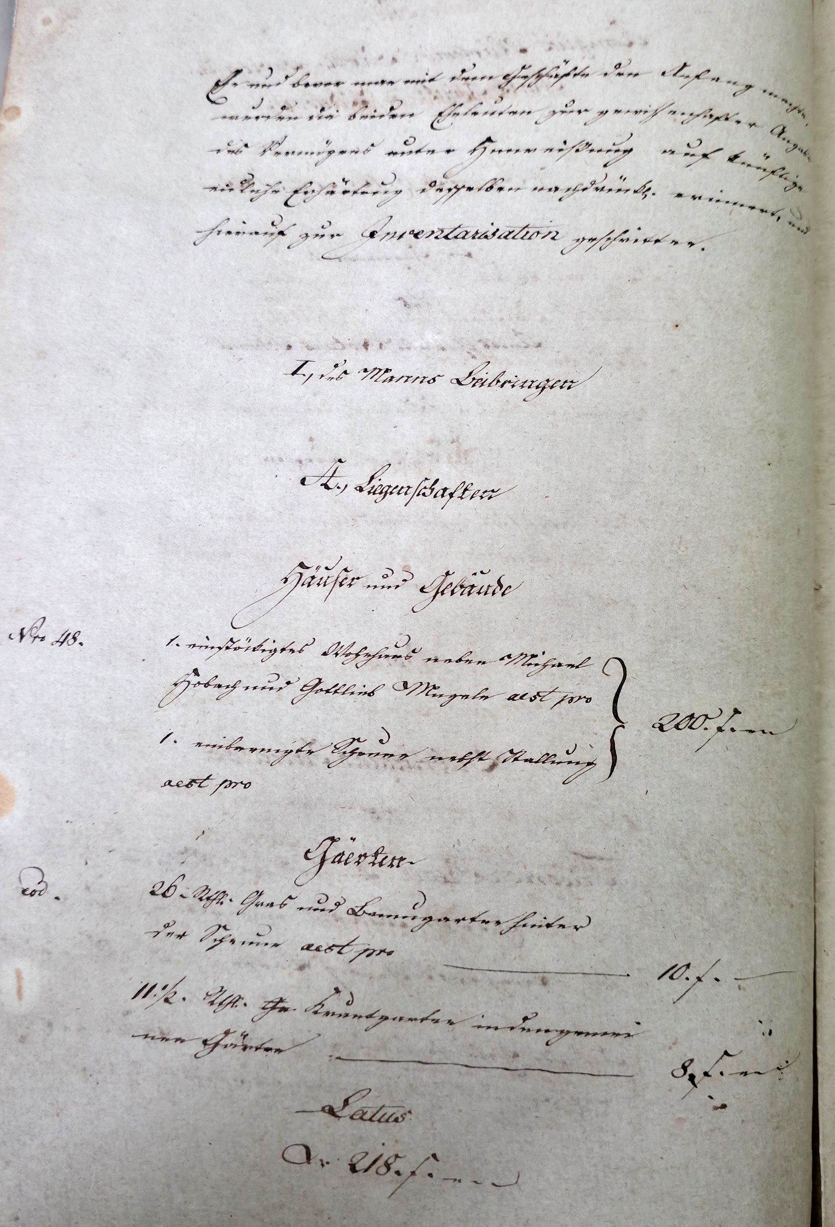 In diesr Beibringensinventur vom 16.09.1830 findet sich das folgende: I. des Manns Beibringen A. Liegenschaften Häußer und Gebäude No.48(1) 1.einstöckiges Wohnhaus neben Michael Hobach und Gottlieb Mugele 1. einbereigte Scheune nebst Stallung 200 fl. Gärten 26 Rth Gras und Baumgarten hinter der Scheuer 10 fl. 11 1/2 Rtl. Krautgarten in den gemeinen Gärten 8 fl. Acker 2 1/2 Vrtl 6.Rth in den LangenAekern neben Friedrich Zorn und Anton Hörcher 40 fl. 1/2 Vrtl 37. Rth im vordern Körner 15 fl. Wiesen 3 Wiesen zusammen 130 fl. Weinberge 2 Parzellen zusammen 100 fl. Summe liegenschaften 503 fl. B. Fahrniß baar Geld 0 fl. Bücher 1. Gesangbuch 20 x. 1. Gebetbuch 12 x. 1. Predigtbuch 24 x. Manns Kleider 8 fl. 47 x. Bettgewand 50 fl. Küchengeschirr 3 fl. 54 x. Schreinwerk 7 fl. 45 x. Summe Fahrniß 72 fl. 22 x. Summa Sumarum des Beibringens des Ehemanns 575 fl. 22 x. II. des Weib Beibringen A. Liegenschaften 0 fl. Weibs Kleider 15 fl. Allerlei Hausrath 1 fl. Summa Fahrniß 16 fl. Summa Sumarum Weibs Beibringen 16 fl. Summarum beider Zusammenbringens 391 fl. 22 x. (1) In der Beibringensinventur wird die Nr.18 genannt. Diese bezieht sich auf die Vermessung von 1818. Nach der Zählweise der Urvermessung von 1839 handelt es sich um das Haus Nr.47