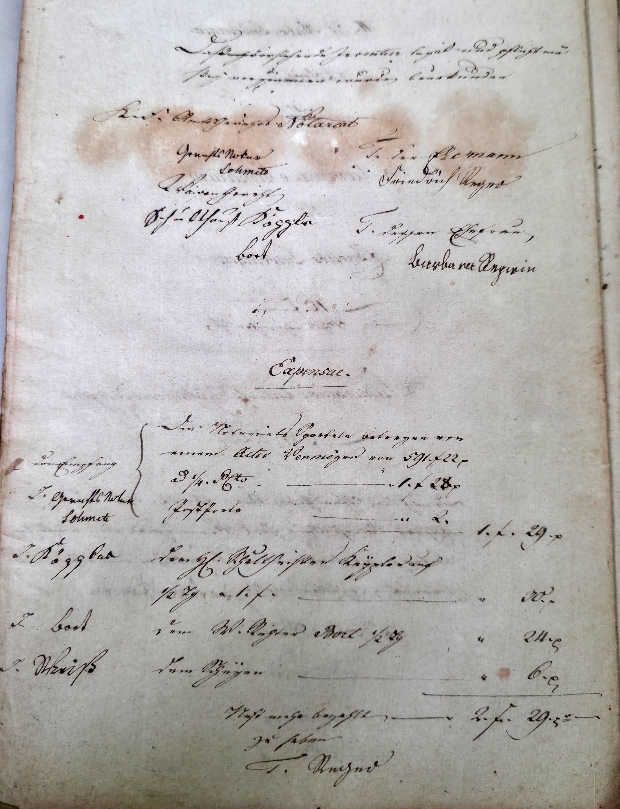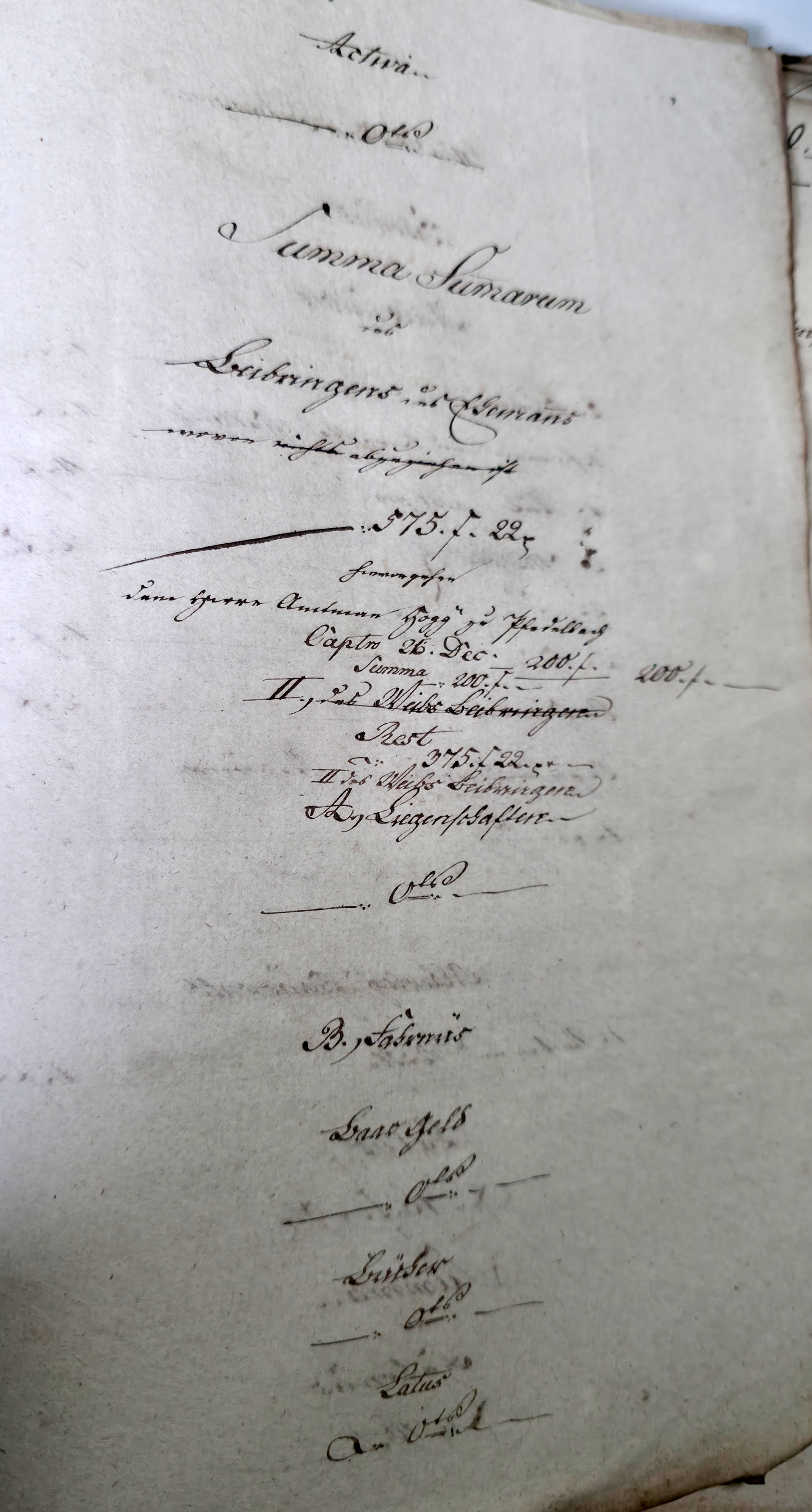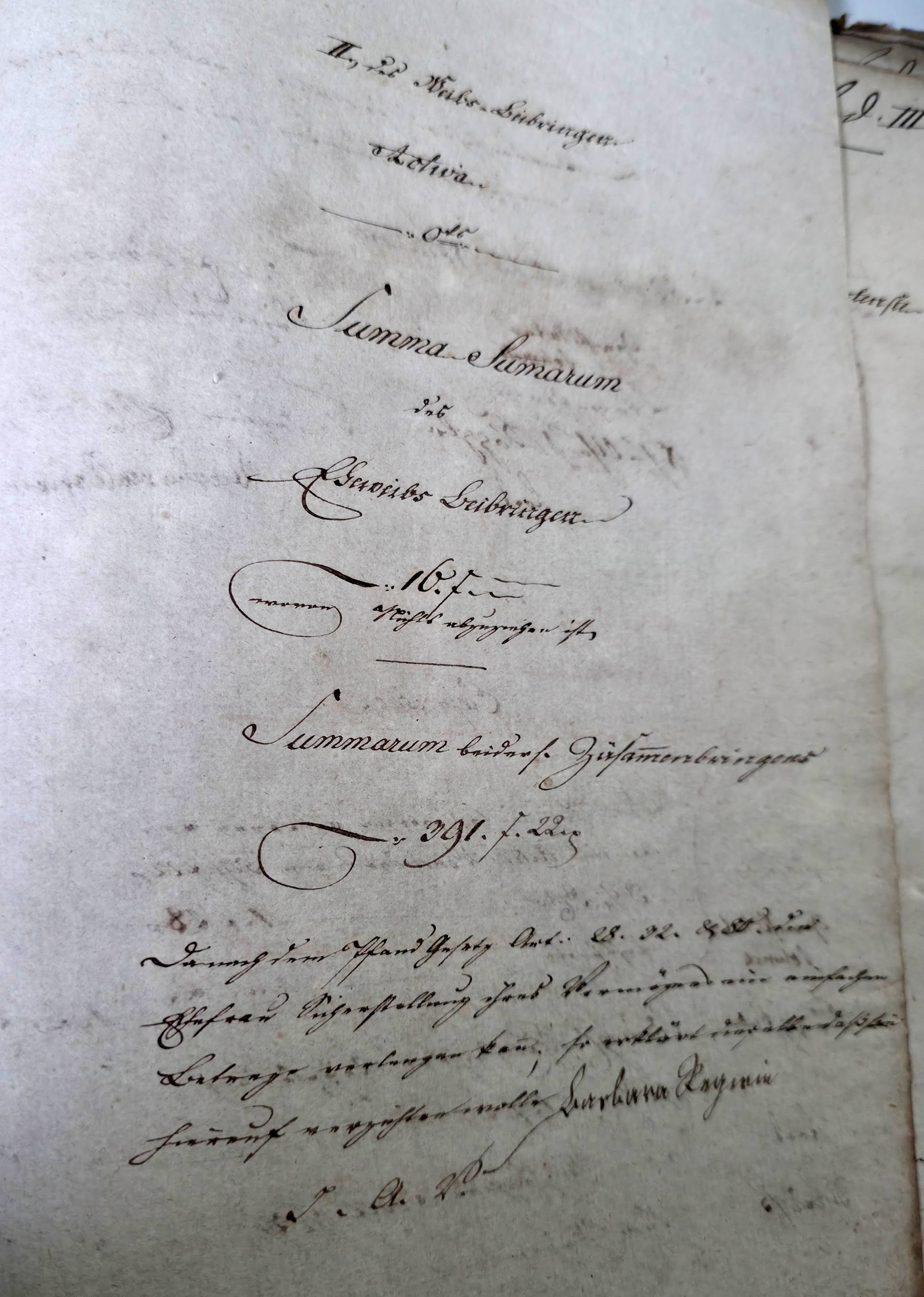 In diesr Beibringensinventur vom 16.09.1830 findet sich das folgende: I. des Manns Beibringen A. Liegenschaften Häußer und Gebäude No.48(1) 1.einstöckiges Wohnhaus neben Michael Hobach und Gottlieb Mugele 1. einbereigte Scheune nebst Stallung 200 fl. Gärten 26 Rth Gras und Baumgarten hinter der Scheuer 10 fl. 11 1/2 Rtl. Krautgarten in den gemeinen Gärten 8 fl. Acker 2 1/2 Vrtl 6.Rth in den LangenAekern neben Friedrich Zorn und Anton Hörcher 40 fl. 1/2 Vrtl 37. Rth im vordern Körner 15 fl. Wiesen 3 Wiesen zusammen 130 fl. Weinberge 2 Parzellen zusammen 100 fl. Summe liegenschaften 503 fl. B. Fahrniß baar Geld 0 fl. Bücher 1. Gesangbuch 20 x. 1. Gebetbuch 12 x. 1. Predigtbuch 24 x. Manns Kleider 8 fl. 47 x. Bettgewand 50 fl. Küchengeschirr 3 fl. 54 x. Schreinwerk 7 fl. 45 x. Summe Fahrniß 72 fl. 22 x. Summa Sumarum des Beibringens des Ehemanns 575 fl. 22 x. II. des Weib Beibringen A. Liegenschaften 0 fl. Weibs Kleider 15 fl. Allerlei Hausrath 1 fl. Summa Fahrniß 16 fl. Summa Sumarum Weibs Beibringen 16 fl. Summarum beider Zusammenbringens 391 fl. 22 x. (1) In der Beibringensinventur wird die Nr.18 genannt. Diese bezieht sich auf die Vermessung von 1818. Nach der Zählweise der Urvermessung von 1839 handelt es sich um das Haus Nr.47