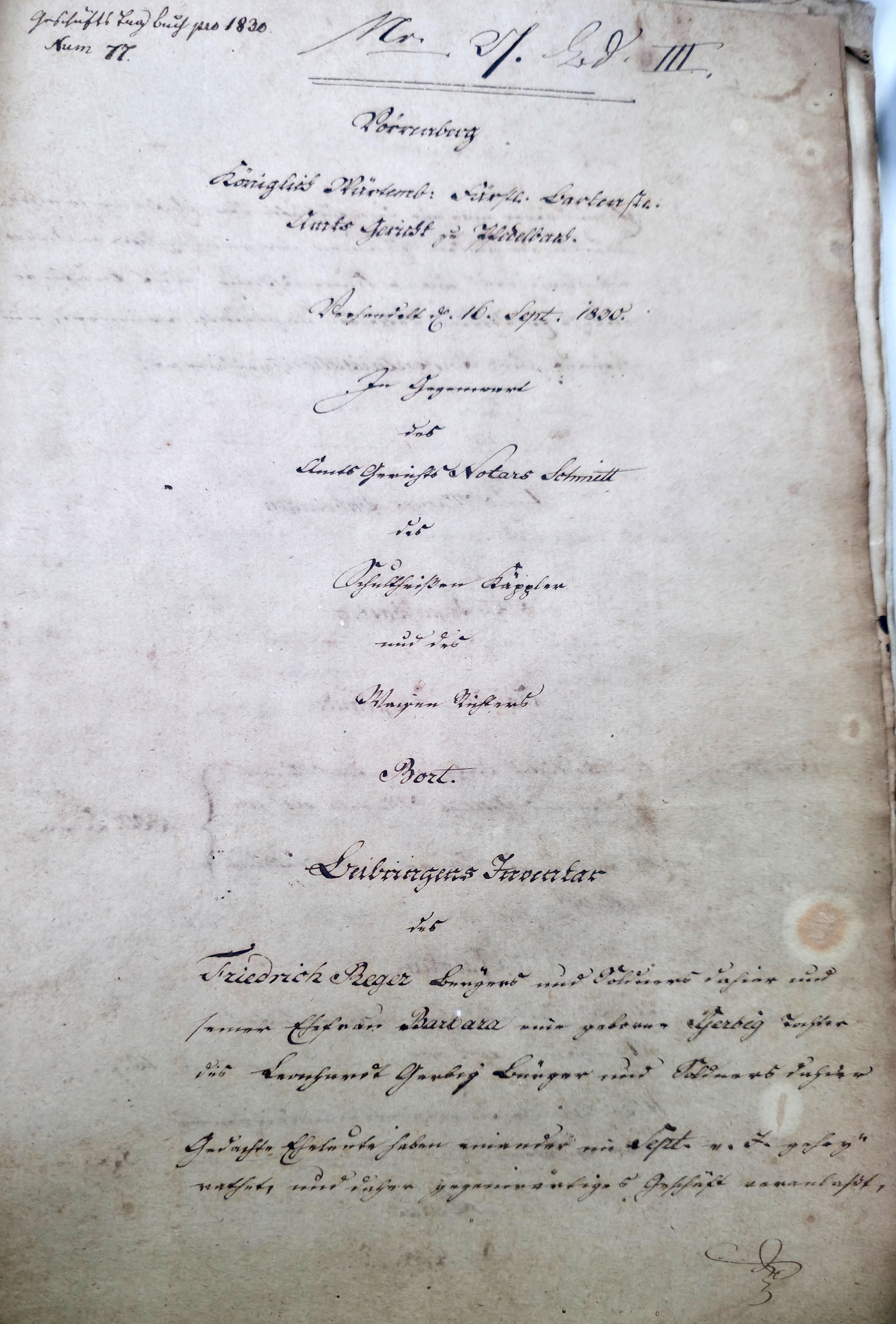 Im Verrenberger Gemeinderatsprotokoll vom 16.September 1846 liest sich das so: Verhandelt Am 16.Septbr. 1846 Vor dem Gemeinderath Friedrich Röger von hier verkaufte Haus u. Scheuer an Schmidt Mäule Eheleute von hier für 350f.. Es ist dies derselbe Reger, der 6.lebendige Kinder, ausserdem aber nur einige geringe Grund Stüke im Besitz hat und nun in den fall gekommen ist, seiner Wohnhausbaufälligkeitshalber veräussern zu müssen. Es ist dies auch derselbe Reger, dem die Gemeinde seiner vielen Kinder wegen schon Besorgniß machte. Es wurde deßhalb heute zwischen dem Gemeinderath und Bürgerausschuß Berathung angestellt und folgendes erhoben: der Hauskaufschilling beträgt 350f. der Anschlag der vorhandenen Güter beläuft sich auf 165f. 515f. Hiervon müssen abgezogen werden: Pfandschulden: Ca.225f. ...zugter Zins 15f. 240f. Rest 275f. Worunter hiernach begriffen ist Baar Geld 110f. Gütherwerth 165f. Nun ist es augenscheinlich, dass Reger mit diesem Ueberrest nicht bauen kann, und in Rücksicht darauf, dass er selbst nicht viel arbeiten mag, Zwangsmittel aber nicht bei ihm ausreichen, dass ferner Reger bei allem Widerspruch mit der Gemeindebehörde das Publicum durch seine Kinder belästigen lässt, man also bei der Lage der Sache durchaus nichts besseres voraussehen kann, als daß Reger wo nicht bald, so doch spät mit Familie der Gemeinde zur Last fallen werde, wurde mit demselben folgende vorläufige Uebereinkunft getroffen: 1) der Haus u Scheuernkaufcontract zwischen Reger u den Mäulischen Eheleute bleibt auftrecht erhalten. 2) Die Mittel des Reger scheinen zu Erbauung eines neuen Hauses unzureichend. Es wird deswegen die Gemeinde ….. voraussetzung, dass Reger sich mehr befleißige, etwas zu erwerben, und seine Familie besser als jetzt zu ernähren unter folgenden Bedinungen Eine Wohnung auf einen ihr beliebigen Platz bauen lassen 1) die Pfandschuld mit 225f. wird baar bezahlt 2) die Kosten der Erbauung eines mäßigen Hauses bestreitet die Gemeindepflege 3) ihr wird vorbehalten, unter zustimmung des Gemeinderaths einen Bauplan zu entwerfen, den Bauplatz auszusuchen und alles das jenige zu thun, was ein vermöglicher Bauunternehmer selbst thun würde. 4) Dagegen ist die Gemeinde berechtigt nicht nur von Reger das Principalpfandrecht auf das neuzuerbauende Haus, sondernauch auf die Güterstüke desselben, wie sie der Pfarrer Jonas …. Verpfändet had, in Anspruch zu nehmen. 5) Nicht nur die Area des künftig zu erbauenden Hauses, sondern dieses selbst wird Pfandobjekt der Gemeinde. Ebenso wird Pfand Object das Grund Eigenthum Regers bestehend in folgenden Güterstüken. - 1/2ar 15R Wiesen in der Neudek - 3 1/2ar 6R Aker im ... - 2 ar 22R ausgehauene Weinberg in der Halden 6) Die Gemeinde darf von Reger nicht gehindert werden, ihre Pfandansprüche an Reger einem andern abzutreten. 7) Wenn Friedrich Reger in den Genuß der neu zu erbauenden Wohnung eingesetzt sein wird, so gibt er sich mit derselben zufrieden. 8) Auf Armenrecht verzichtet Reger für sich u. seine Familie gegen über der Gemeinde 9) Die Gemeinde bleibt beständiger Vormund Regers und Activ oder Passiv Wahl Rechte hat derselbe keine, auch 10) Verpflichtet sich die Ehefrau des Reger, ihr Beibringen niemals gegen über der Gemeinde zu reclamieren und 11) Demjenigen, der mit der Bauaufsicht und der Verwendung des Erlöses aus den bisher besessenen Gebaulichkeiten beauftragt wird, vercaufsfreiheit in allen Stüken zuzugestehen; so wie denn 12) Die Gemeinde sich ein Vorkaufs Recht bei allen künftigen Veräusserungsfällen vorbehält und 13) Auf alle mögliche Einreden, insbesondere die der Ueberredung Uebereilung, des Irrthums verzicht geleistet wird |