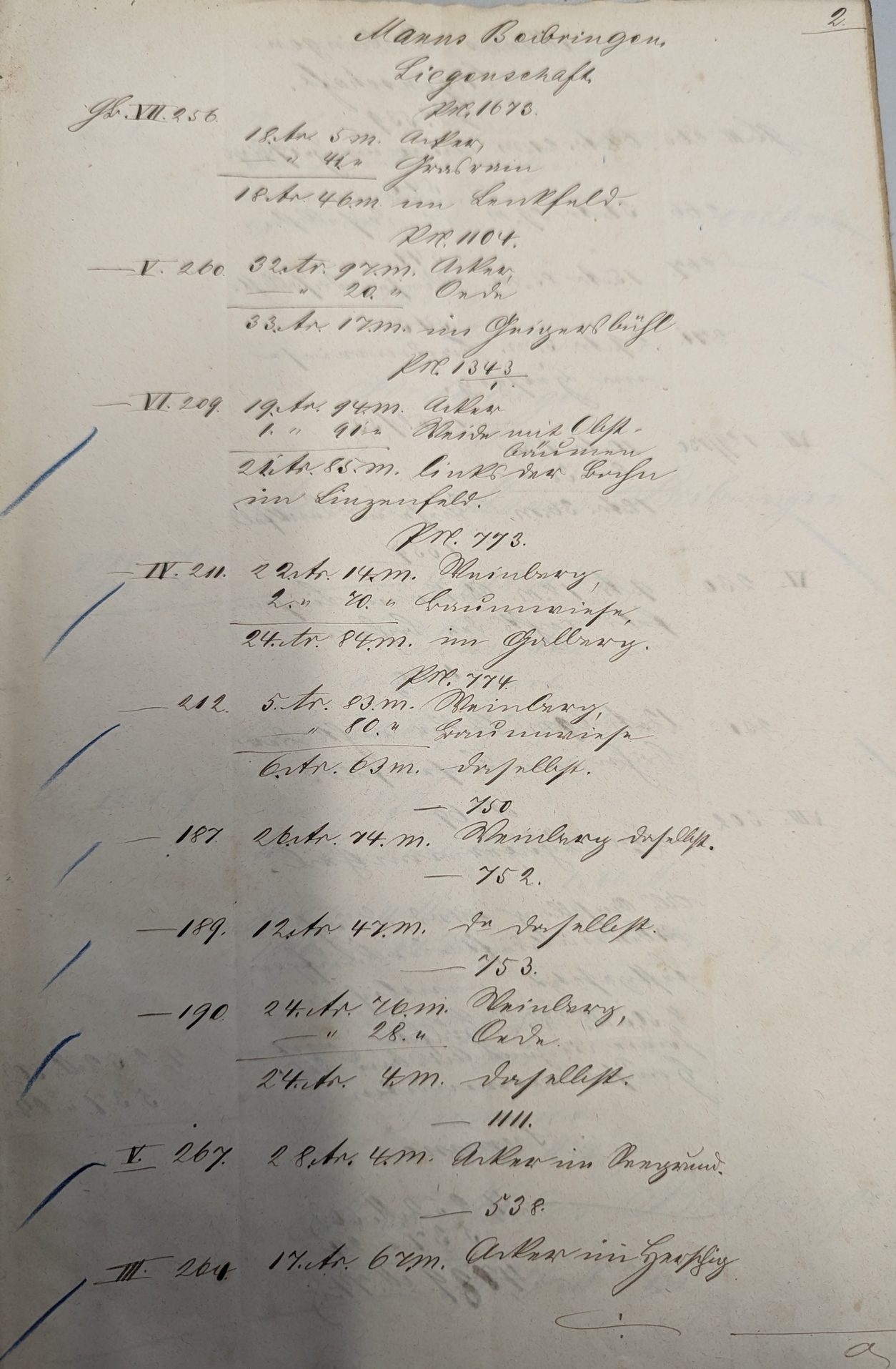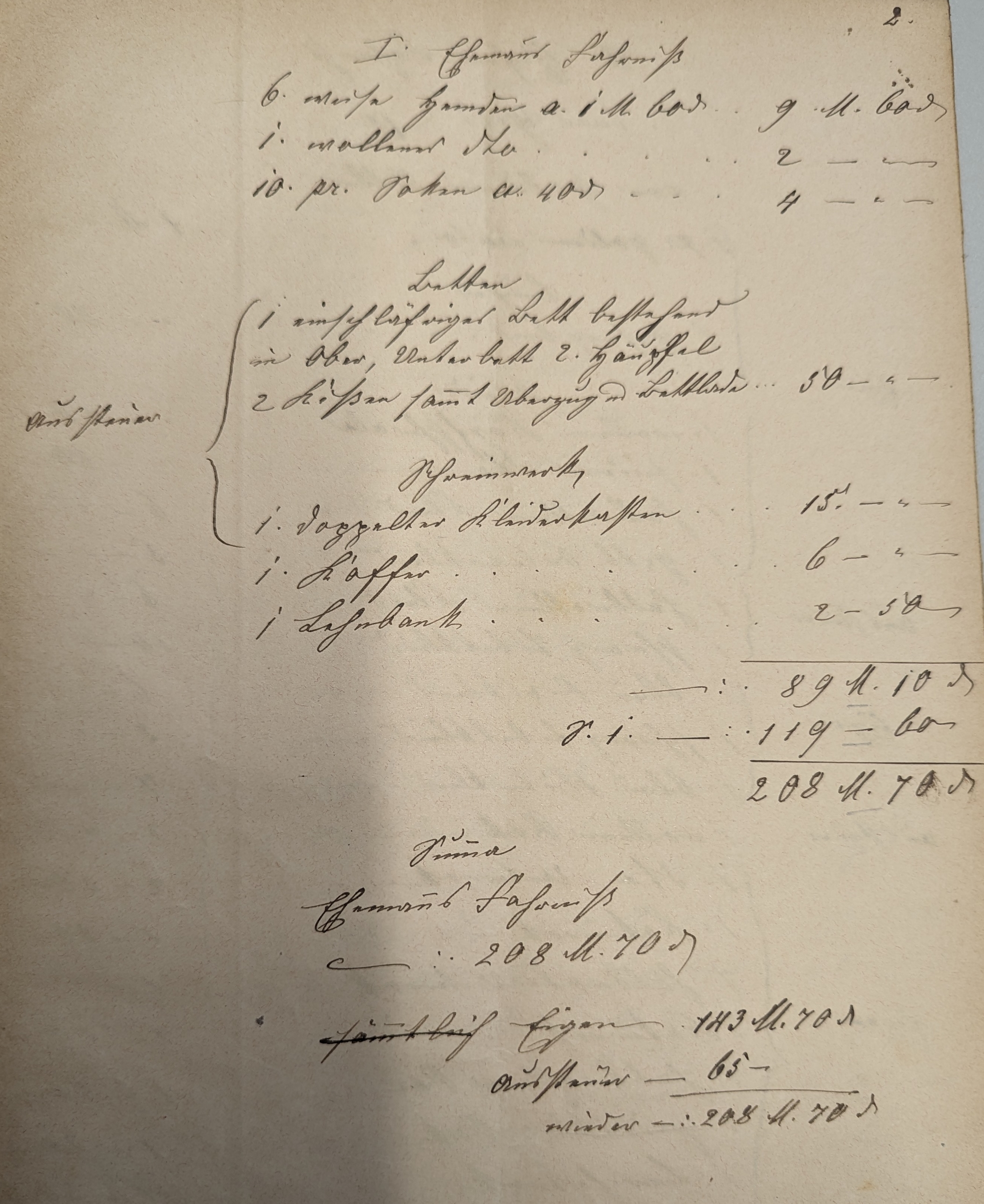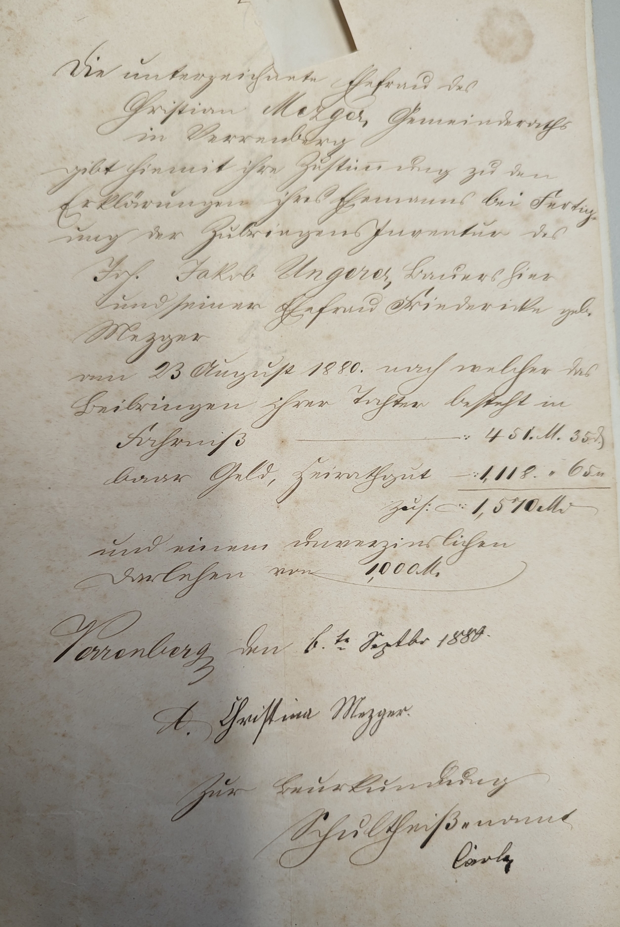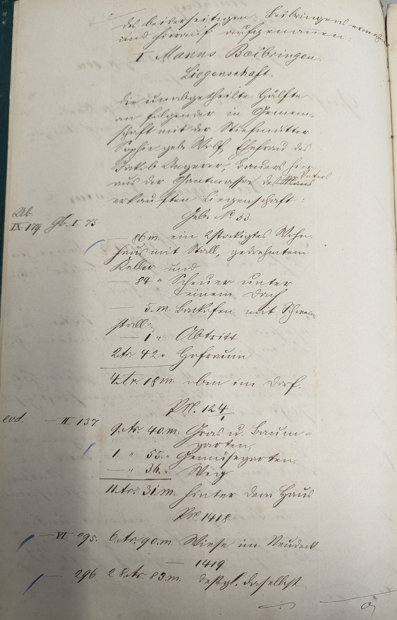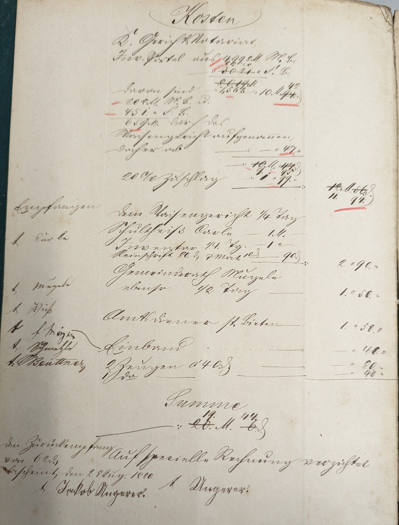 In dieser Beibringinventur vom 23.08.1880 findet sich das folgende: Manns Beibringen: Liegenschaft: "die unabgetheilte Hälfte an folgeder in Gemeinschaft mit der Stiefmutter Sophie Wolf, Ehefrau des Jacob Ungerer, Bauershier aus der Gantmasse des Vaters erkauften Liegenschaft Geb. No.33 ...." Hinzu kommen Gras- und Baumgarten, Wiesen, Äcker, Weinberge und ein Schäfereianteil. 4.252 M. 50 d. Fahrniß 208 M. 70 d. Forderungen 0 M. Summe Manns Beibringen 4.998 M. 44 d. Schulden: 1.570 M. 70 d. Rest Manns Beibringen 3.427 M. 74 d. Frau Beibringen Liegenschaft 0 M. Fahrniß baar Geld 2.118 M. 65 d. Fahrniß 451 M. 35 d. Forderungen 0 M. Summe Frau Beibringens 2.570 M. "Den Eltern, unverzinsliches Darlehen dessen 1/4jährlige Aufkündigung sie sich vorbehalten 1.000 M." Rest Frau Beibringens 1.570 M. "Uebereinkunft 1. Die Ehefrau wird Miteigenthümerin der vom Mann im ledigen Stande aus der Gantmasse seines Vaters erkauften Liegenschaft wie sie oben Bl... beschrieben ist und es soll dieselbe wie während der Ehe erkauft und zur Erzeugenschaft gehörig betrachtet werden. 2. Der Mann tritt diese Liegenschaft um den Ankaufspreis u. die zum Ausbau des Hauses verwendete Summe, zusammen also für 4.789 M. 74 d. an die Errungenschaftsgesellschaft ab. Die darauf haftende Schuld wird Socialschuld 3. die Contrahenten verzichten auf alle Einrede gegen diese Übereinkunft namentlich die des Irrthums, der Überredung und der Verletzung."